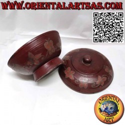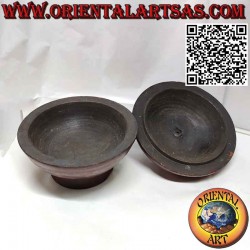 Antica contenitore con coperchio tondo in legno mogano colorata con disegni floreali fatta a mana dai Dayak popolo del Borneo Malese, Pezzo unico unico acquistato nel 1985 nel Bornio Malese occidentale da un collezionista di opere d'arti del posto.