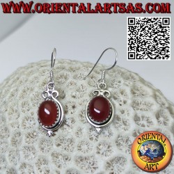 Orecchini in argento con corniola ovale incastonata e 3 cerchi sopra e 3 pallini sotto, realizzato in argento 925‰ anallergico senza nichel. La superficie è in parte brunita il che ne garantisce la bellezza con il passare dell'anno non é placata