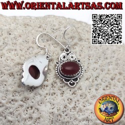 Orecchini in argento con corniola ovale naturale incastonata di traverso stile barocco con due spirali in alto, fatto a mano in argento 925‰ anallergico senza nichel. La superficie è in parte brunita il che ne garantisce la bellezza con il passare dell'anni. (Non é placata)