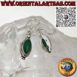Orecchini in argento con agata verde a navetta contornata da treccia, la superficie è parzialmente brunita e non è trattata né placcata quindi garantisce la sua bellezza col passare degli anni, con agata verde incastonata.