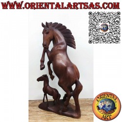 Scultura di una cavalla con il suo puledro intagliata e scolpita a mano da un unico blocco di legno da abili artigiani.