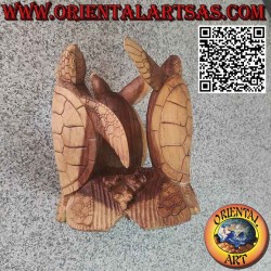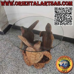 Tavolo rotondo con base di tre tartarughe intagliate e scolpite a mano in un tronco in legno di suar, e ripiano in cristallo molato tondo.